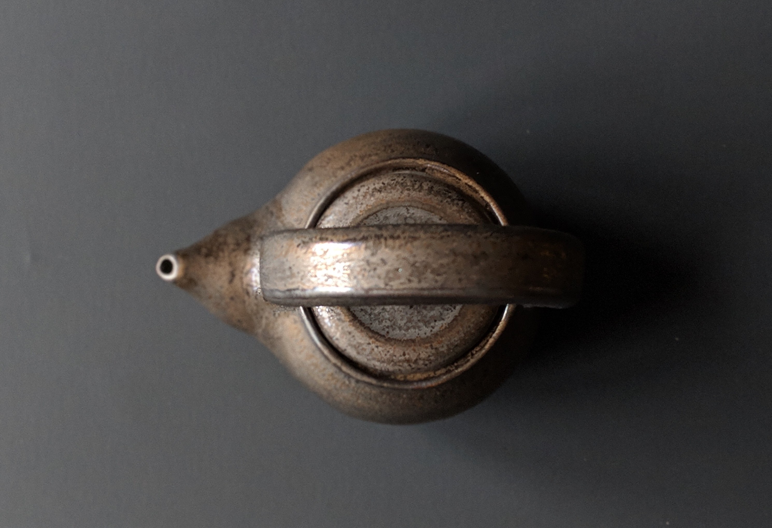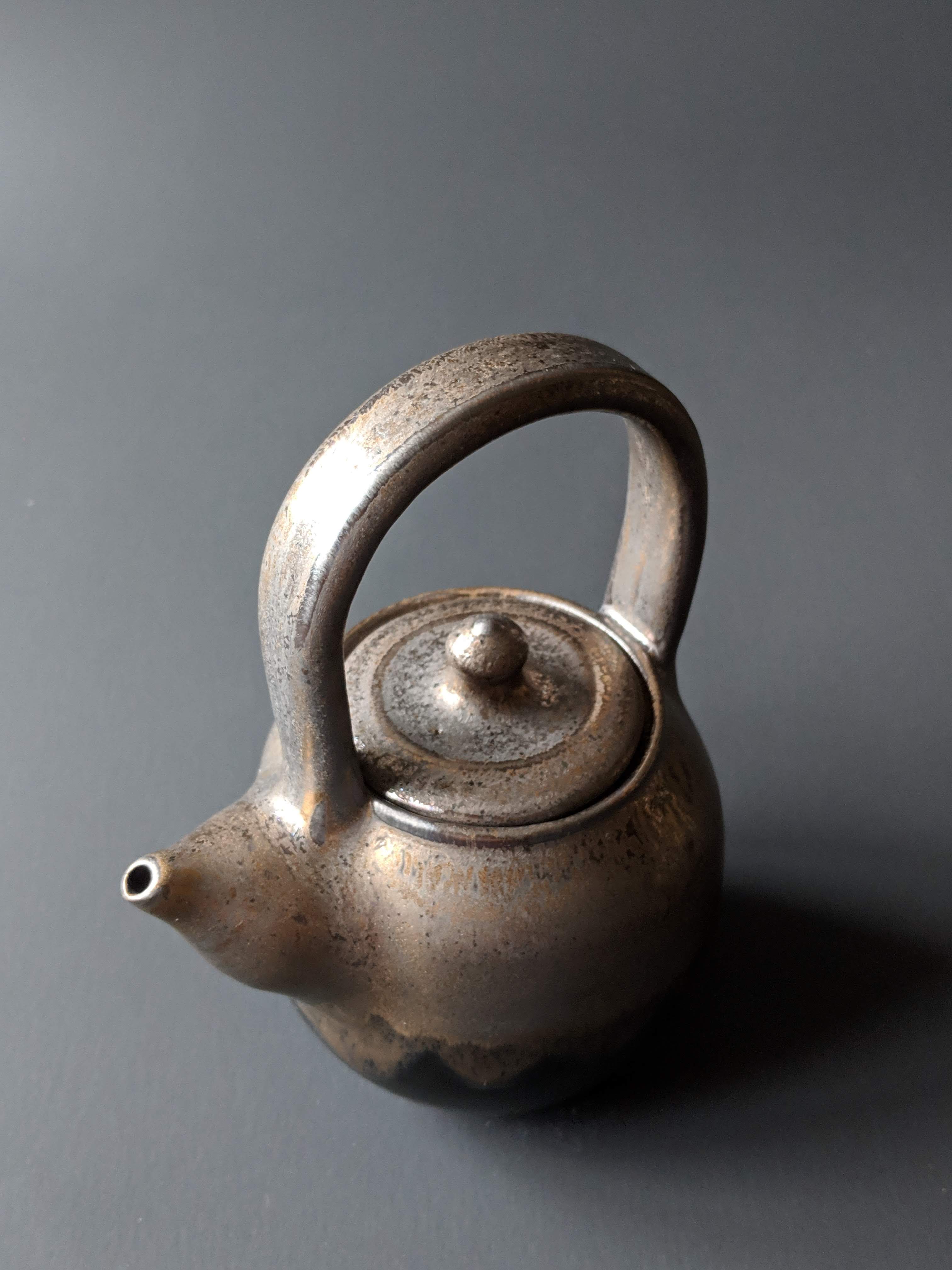 Black stoneware tea set layered and dripped with metallic bronze glaze.